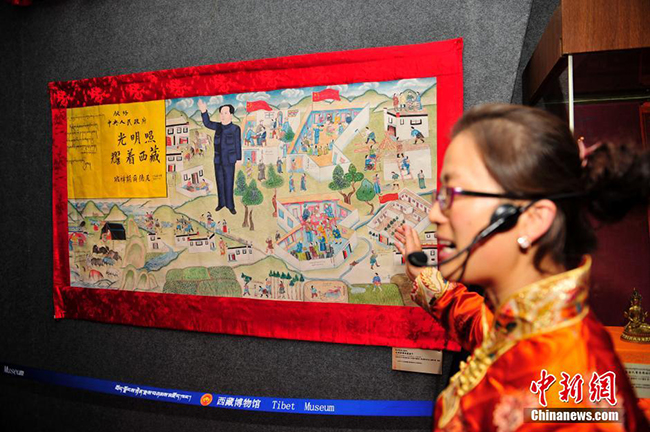 工作人员介绍1954年十世班禅额尔德尼敬献给中央政府的唐卡。 中新社发 唐朝杨 摄