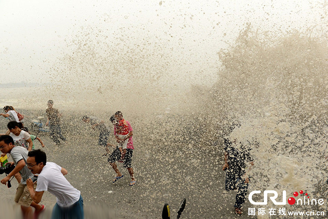 2014年8月11日,农历七月十六,钱江潮水在杭州下沙江堤掀起巨浪,瞬间打湿了观潮者。受“超级月亮”影响,这两天的钱江潮壮观程度堪比往年八月十八潮。图片来源:东方IC