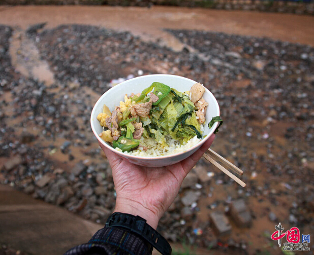 2014年8月9日,云南鲁甸地震灾区的现场,灾民共同制作的一顿饭,村民告诉记者,肉是外出打工的村民购买回来的,望着眼前的这碗饭,难以下咽。(中国网记者 杨佳摄影)