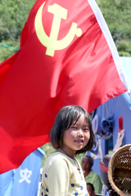8月10日,记者在鲁甸县地震灾区龙头山镇灾民安置点摄下一名小女孩在自家帐篷前悠闲生活的镜头。在党旗下的她,忘却了地震灾难给她带来的伤痛。