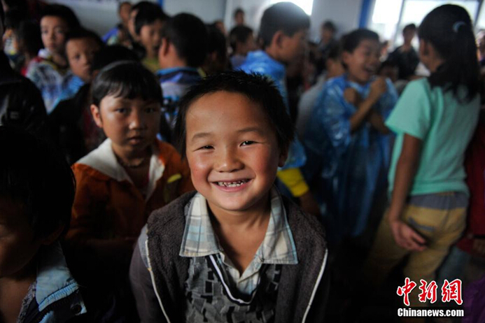 8月11日,震区第一课在龙头山镇中心小学的板房教室开课,青基会的社工带着孩子们做起游戏,孩子们心情逐渐放松,久违的笑容再次回到脸上。中新社发 刘冉阳 摄