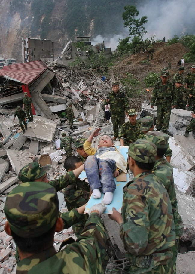 2008年5月13日早晨,3岁的小郎峥被解放军官兵从废墟里救出后,躺在一块小木板做的临时担架上,用他稚嫩的右手向8位抬着他的解放军叔叔敬了个少先队的礼,绵阳晚报记者杨卫华用相机记录这一感人瞬间。这张照片公布后,小郎峥引起了社会各界的高度关注。温家宝总理曾两次到医院看望小郎铮,称赞他“坚强、勇敢”。