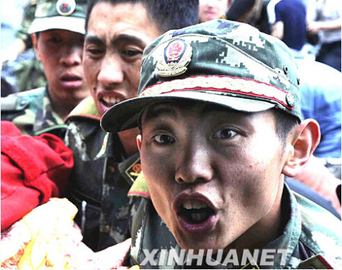 5月14日,在四川汶川县映秀镇,心急如焚的部队官兵将重伤员送上直升机时露出的神情。