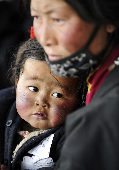 4月21日,在玉树巴塘机场的山西医疗队临时救治站,藏族妇女白马卓嘎搂着4岁的儿子扎西兰舟等待转移。 在玉树地震中,白马卓嘎失去了两个儿子,一提及丧子之痛, 白马卓嘎便忍不住流下眼泪。小扎西是她唯一幸存的儿子,但目前心脏出现了问题,急需转往西宁救治。 新华社记者 郭磊 摄
