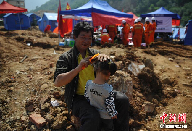 8月7日,在云南鲁甸龙头山镇灾民安置点,一名男子在给女儿编辫子。中新社发 刘冉阳 摄