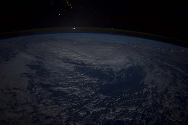黑夜之中,飓风夏利奥盘旋在夏威夷岛上空,形成强大的螺旋气流。