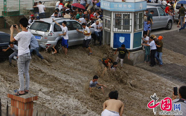 中国网8月13日讯 2014年8月13日下午2点30分左右,钱江大潮在杭州市萧山美女坝冲击丁字坝后形成的回头潮十分凶猛,经过碰撞翻越护栏,冲上江堤,现场有多人被冲湿。当日是农历七月十八,大潮汛。