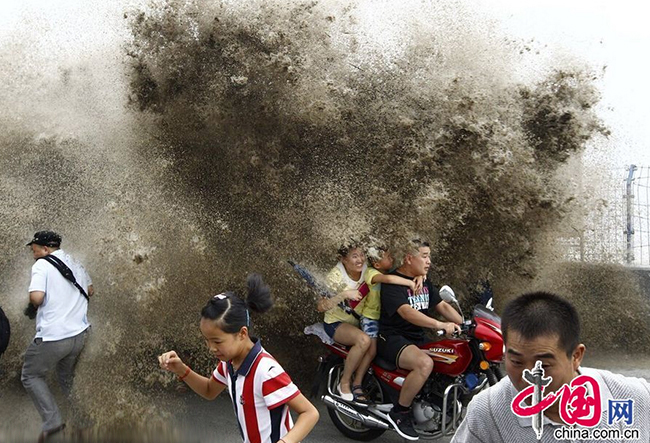 2014年8月13日下午2点30分左右,浙江省杭州市,钱江大潮在萧山美女坝冲击丁字坝后形成的回头潮十分凶猛,经过碰撞翻越护栏,冲上江堤,现场有多名观潮人被大潮打湿。(图片作者:张祥荣/CFP)