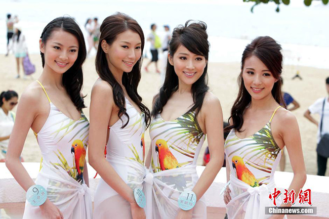 8月14日,参加《2014香港小姐竞选》竞选的十六位候选佳丽在浅水湾海滩为背景,以泳装亮相,展演优美体态及魅力风采,为8月24日准决赛及31日的决赛做准备。洪少葵 摄