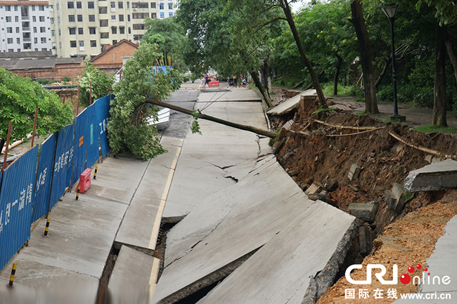 2014年8月18日,广西壮族自治区南宁市,下午4点50分左右,振宁翠峰小区进出口前道路坍塌,坍塌面积约800多平米,所幸没有人员伤亡。 图片来源:黄自在/东方IC