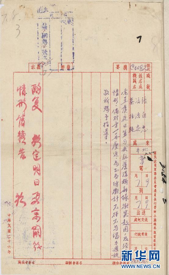 这是1937年7月8日,第37师师长冯治安等报告日军挑起卢沟桥事变经过致军政部部长何应钦电。