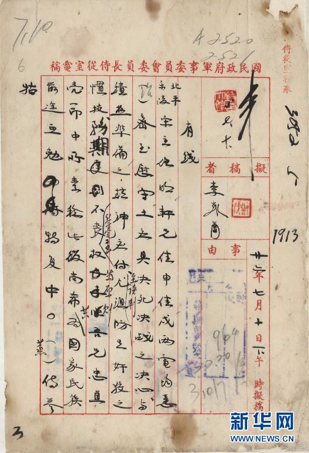 这是1937年7月10日蒋介石为应抱决死决战之决心与积极准备之精神致第二十九军军长宋哲元电稿。
