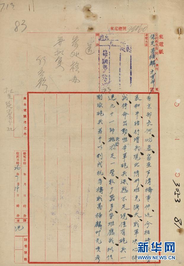 这是1937年7月13日第五十三军军长万福麟请增派炮兵致军政部部长何应钦电。