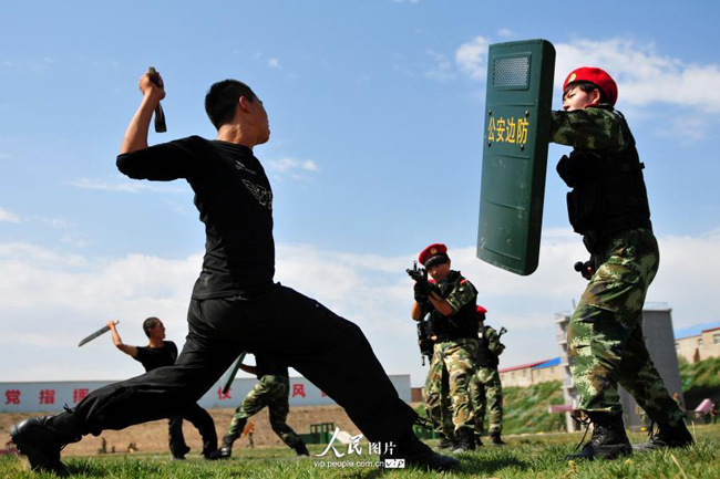 模拟安保过程中可能发生的刀斧袭警暴恐案件进行反袭击训练。
