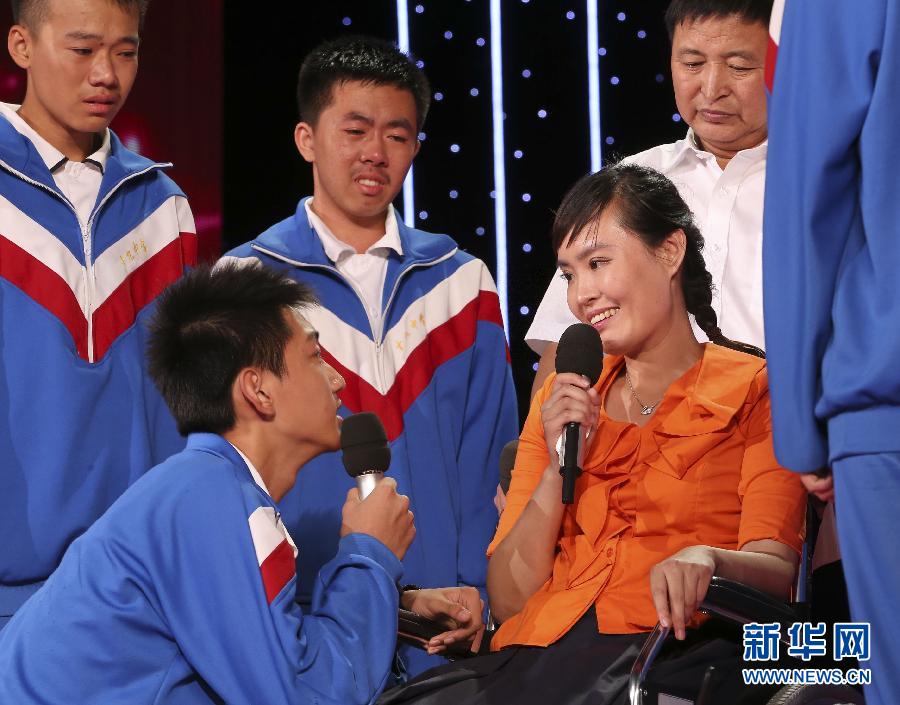 这是张丽莉和她的学生在中央电视台教师节晚会录制现场(2012年9月4日摄)。张丽莉是黑龙江省佳木斯市第十九中学教师,在2012年5月8日的一次交通事故中,她为救学生而受重伤,致使双腿截肢。新华社记者 丁林 摄