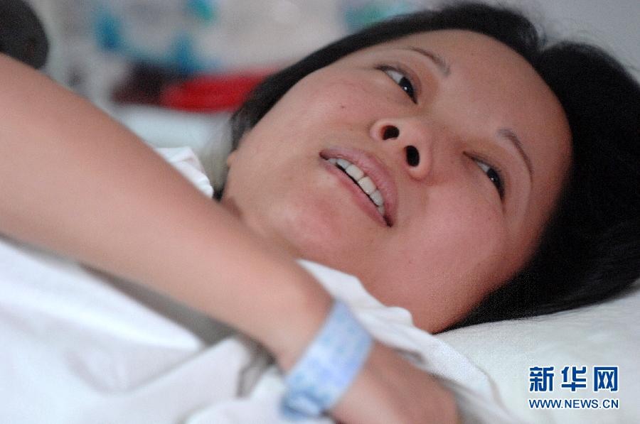 这是吴菊萍躺在浙江富阳市中医骨伤医院的病床上(2011年7月13日摄)。杭州市民吴菊萍用双臂接住从10楼坠下的小女孩妞妞。孩子幸运地获救了,她的手臂却骨折三截。新华社发