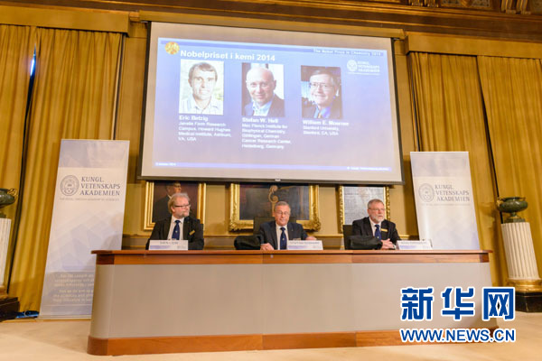 10月8日,在瑞典首都斯德哥尔摩,瑞典皇家科学院常任秘书诺尔马克(中)宣布2014年诺贝尔化学奖得主。新华社发(石天晟摄)