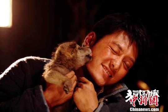剧照。《狼图腾》主演冯绍峰与小狼亲密接触。 马海燕 摄
