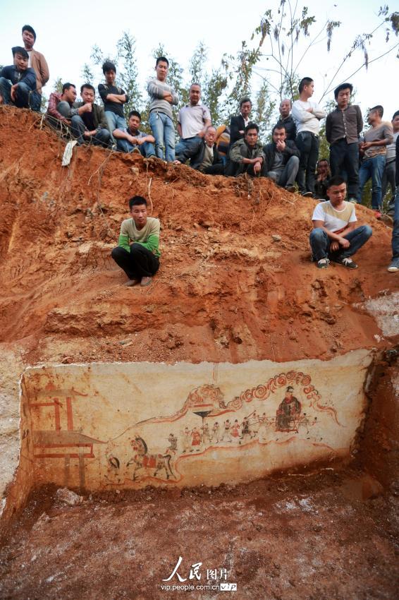 当地政府派出近百名警察、民兵赶来维护现场秩序。经过施工队伍和文物工作人员在现场发掘,古墓由石灰等建设成的一个长约4米、高和宽约1米5的整体墓体,大石板当成了墓门。挖掘机将墓体破开后,在古墓内清理出来尸骨等遗物。但是令人惊奇的是古墓里面墙体有色彩鲜艳的马车、人物绘画。左右对称,墓盖为八卦图,墓头为坐佛头像。