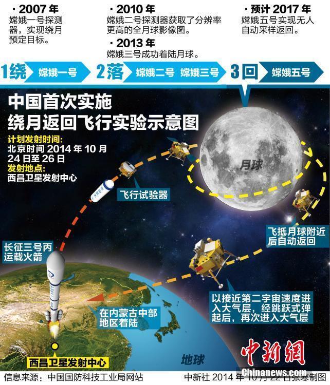 北京时间10月22日,中国国防科工局新闻发言人宣布,中国探月工程将首次实施再入返回飞行试验,飞行试验器计划于10月24日至26日择机在西昌卫星发射中心发射。