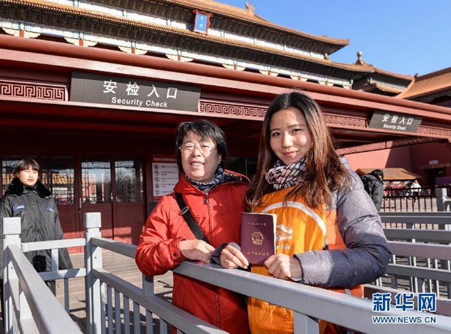 12月3日,一名教师(右)在故宫博物院入口处展示教师资格证。新华社记者 李贺 摄