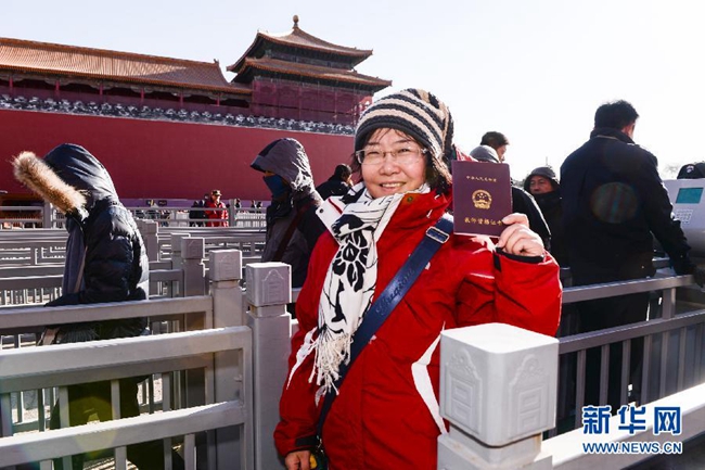 12月3日,一名参观故宫的教师在检票口附近展示教师资格证书。新华社记者 李贺摄