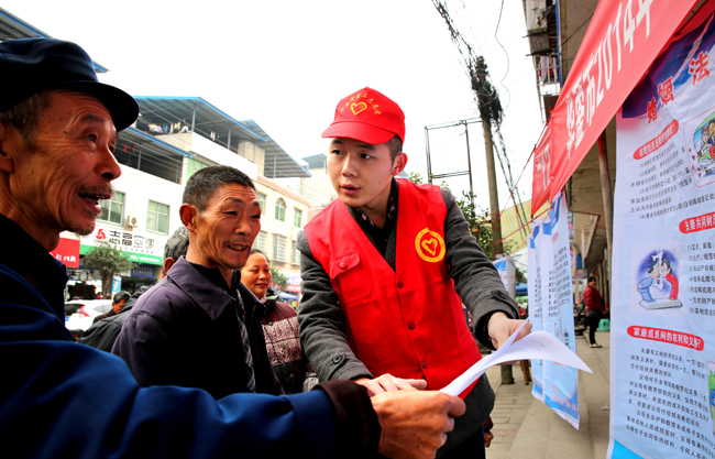 12月2日,在四川省华蓥市高兴镇的集市上,参加“宪法宣传赶场”活动的青年志愿者向赶场的群众宣讲宪法知识。新华社发(邱海鹰 摄)