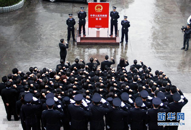11月24日,重庆市云阳县人民法院的干警面向《宪法》宣誓。当日,重庆市云阳县人民法院举办纪念设立“国家宪法日”主题实践活动,全院160多名干警面向《宪法》庄严宣誓,并在“弘扬《宪法》民主精神,履行使命公正司法”条幅上签名。十二届全国人大常委会第十一次会议于11月1日审议通过了关于设立国家宪法日的决定,明确将12月4日设立为国家宪法日,国家通过多种形式开展宪法宣传教育活动。新华社发(覃辉 摄)