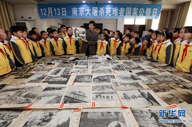 12月11日,民间收藏爱好者杨义平(中)向枣庄市红旗小学的学生展示侵华日军在南京大屠杀时出版的画报。当日,在12月13日首个“南京大屠杀死难者国家公祭日”到来之际,山东省枣庄市红旗小学举行“勿忘国耻公祭南京大屠杀死难者”主题教育系列活动,邀请民间收藏爱好者杨义平来校展示他收集的侵华日军在南京大屠杀时出版的画报、使用的防毒面具等实物,教育学生时刻铭记历史,勿忘国耻。孙中喆 摄