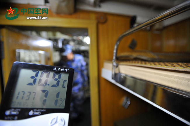 高温、高湿常年伴随着潜艇兵,这是2014年12月3日,潜艇内官兵宿舍里的温度和湿度。穆瑞林 摄