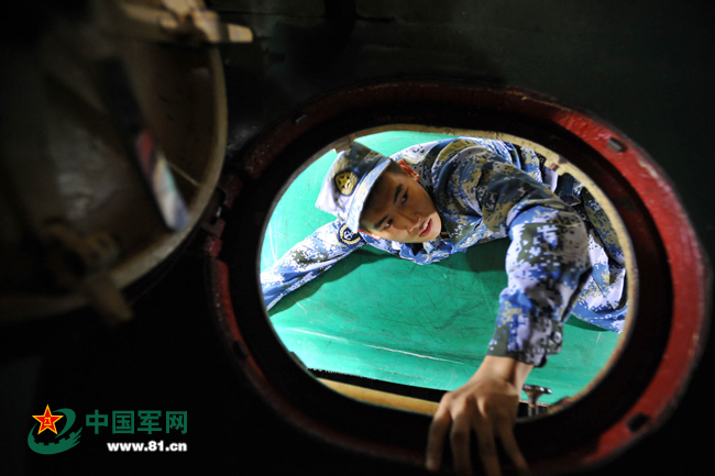 战士吴松林在高度不足1米的电池舱工作时,根本没法直起腰,他必须趴在滑板车上来回作业。穆瑞林 摄
