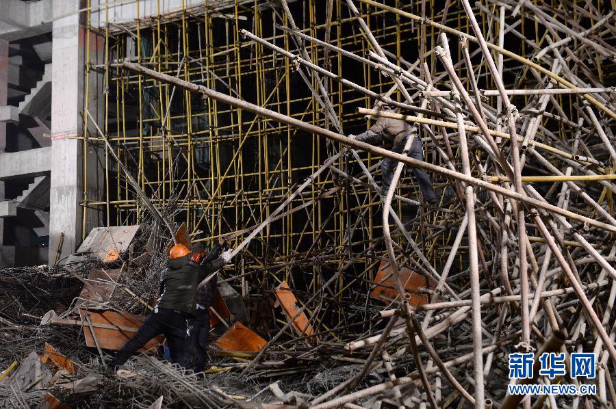 2月9日,救援人员在事故现场拆除垮塌的脚手架。新华社记者胡超摄