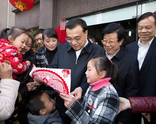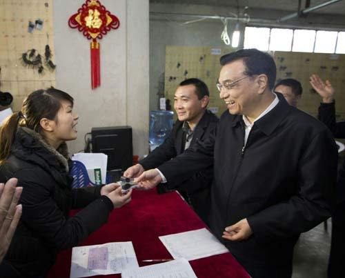 【棚改搬迁居民从总理手中领到新房钥匙】14日下午,在贵阳棚改小区渔安新城,棚改搬迁居民肖文梅从李克强手中领到新房钥匙。当天,很多居民正在排队领取新房钥匙,总理受邀一起发送钥匙。他对排队的人群说:“希望这把钥匙不仅可以打开你们的新房,也能开启你们的新生活。”