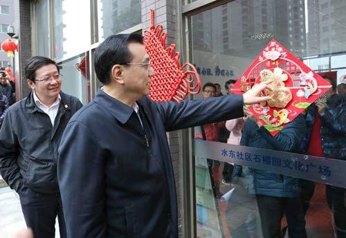 【李克强为棚改新区贴“福”】“希望这个‘福’字,能让你们鱼乐连年,富贵有余。”李克强14日把一张烫金“福”字,亲手贴在贵阳渔安新城棚改新区的大门上,送上对这个新建小区的新春祝福。他叮嘱小区负责人,棚户区改造不仅是建新房子,也是创造新生活,要营造宜居环境,让居民住得称心、安心、舒心。