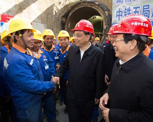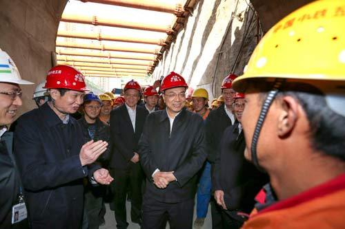 【李克强叮嘱省领导:要让轻轨建设功臣将来乘坐首班列车】14日,李克强来到贵阳轻轨1号线施工现场,考察城市基础设施建设。总理戴上安全帽走进隧道,询问工程进度。多数施工者来自农村,李克强称赞他们是城市功臣。他叮嘱省领导,等这条轻轨修通后,你们一定要请回这些一线建设者,乘坐首班列车。