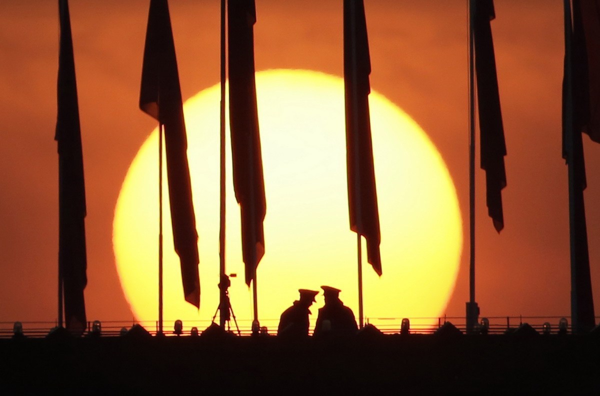 2015年3月5日,北京,国家博物馆的屋顶上,日出的红光勾勒出两名在红旗下守卫的武警轮廓。当日,全国人民代表大会(NPC)在北京人民大会堂开幕。REUTERS/Jason Lee