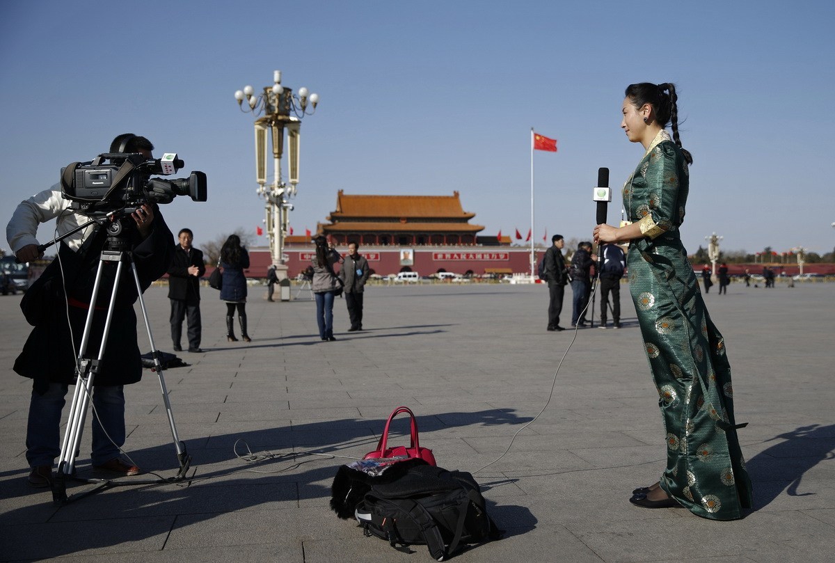 2015年3月3日,北京天安门广场,中国人民政治协商会议期间,一名记者身穿民族服装在报道两会。REUTERS/Kim Kyung-Hoon