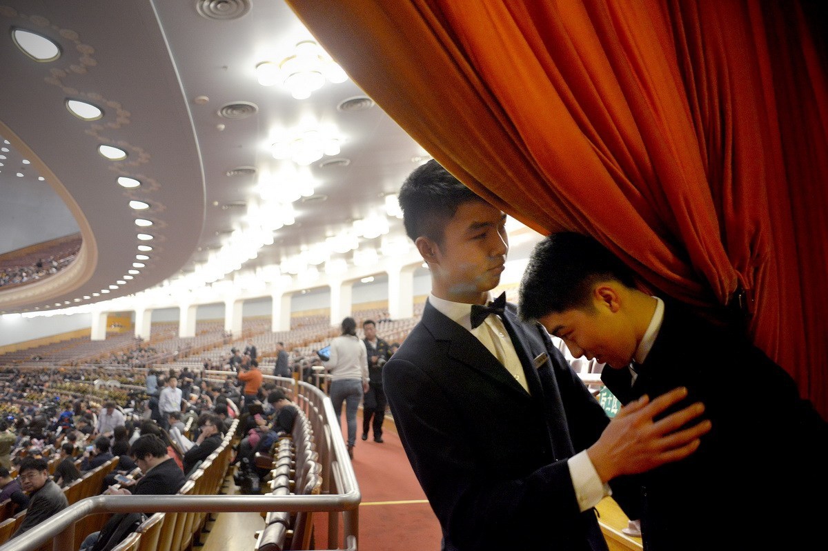 2015年3月3日,中国人民政协会议在北京人民大会堂举行,两名服务员在大厅的入口处聊天。AFP PHOTO / WANG ZHAO