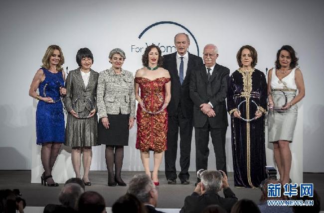 3月18日,中国教授谢毅(左二)在法国巴黎出席2015年度“世界杰出女科学家奖”颁奖仪式。当日,2015年度“世界杰出女科学家奖”颁奖仪式在巴黎索邦大学举行,包括中国科学技术大学谢毅教授在内的5位女科学家获得该奖项。“世界杰出女科学家奖”由联合国教科文组织和法国欧莱雅集团联合设立,每年从全球各大洲遴选出5位为科学进步做出卓越贡献的女性,旨在公开表彰女科学家的杰出成就,并为其科研事业提供支持。教科文组织说,谢毅教授凭借其在无机化学领域的杰出贡献而获得表彰。新华社记者陈晓伟摄