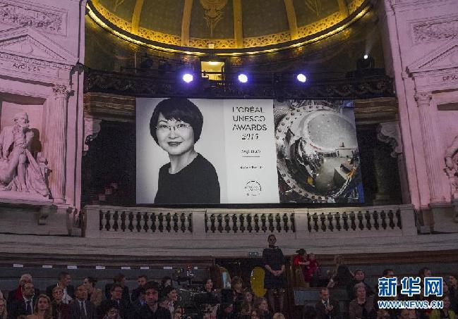 3月18日,在法国巴黎,中国教授谢毅的巨幅照片悬挂在2015年度“世界杰出女科学家奖”颁奖仪式大厅内。当日,2015年度“世界杰出女科学家奖”颁奖仪式在巴黎索邦大学举行,包括中国科学技术大学谢毅教授在内的5位女科学家获得该奖项。“世界杰出女科学家奖”由联合国教科文组织和法国欧莱雅集团联合设立,每年从全球各大洲遴选出5位为科学进步做出卓越贡献的女性,旨在公开表彰女科学家的杰出成就,并为其科研事业提供支持。教科文组织说,谢毅教授凭借其在无机化学领域的杰出贡献而获得表彰。新华社记者陈晓伟摄
