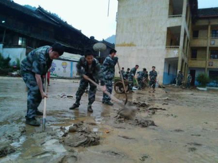 5月27日傍晚,民兵应急分队在贵州黔东南榕江县平阳乡小丹江小学除於泥(手机拍摄)。