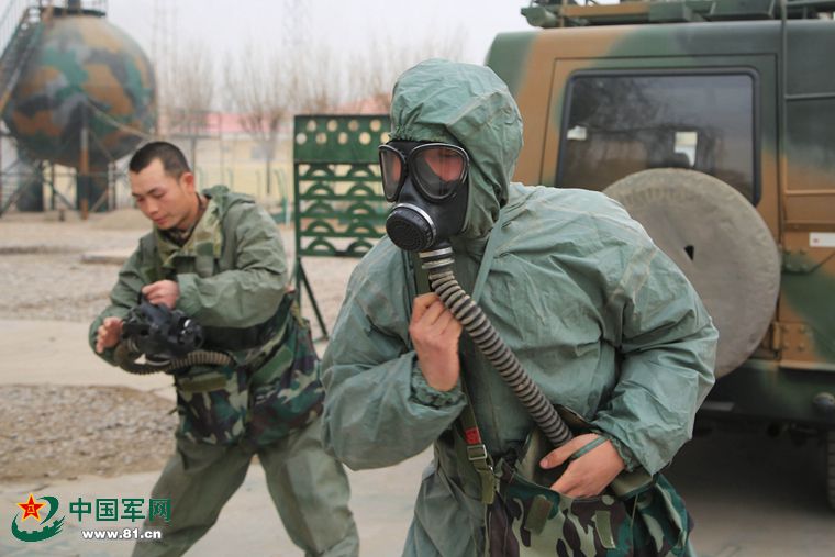 3月6日,陆军第21集团军某防化团应急分队官兵紧急防护。