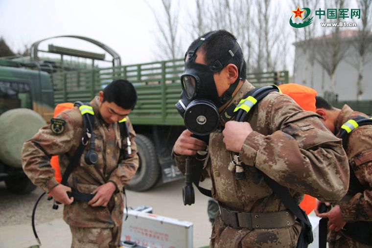 3月6日,陆军第21集团军某防化团应急分队官兵紧急防护。