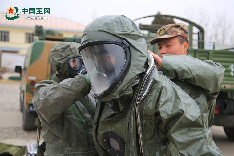 3月6日,陆军第21集团军某防化团应急分队官兵紧急防护。