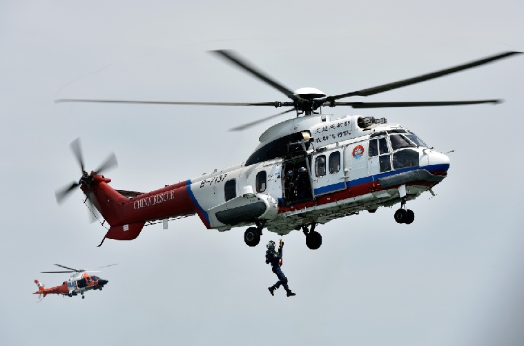 5月19日,交通运输部南海救助飞行队的直升飞机和救助人员在演习现场进行落水人员救助。