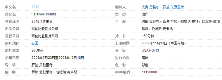 《2012》是一部关于全球毁灭的灾难电影,由罗兰·艾默里奇执导,约翰·库萨克、桑迪·牛顿、阿曼达·皮特和切瓦特·埃加福特等联袂出演,影片于2009年11月13日在美国上映。