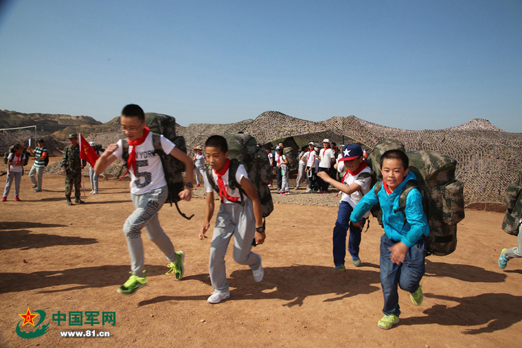 “解放军叔叔背着背囊跑5公里,我们跑50米。”学生们开展背背囊50米跑竞赛。高方录摄