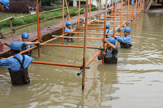 为保护电力设施,保障电力供应,中国华电江苏公司所有检修、安保等专业管理人员轮流值守,党员突击队、青年突击队坚守抗灾抢险前线,确保人员及设备安全,确保电厂用煤需求;中国电建武汉地铁11号线抗洪抢险突击队历经24小时,共转运沙袋千余袋,将围堰加高至1米,保护了变电所安全,挽回损失百万元;神华国华九江电厂职工在高温下加固输煤二号转运站12米基坑边坡,抢修了近300米的水上便民通道,守住了电厂能源供应的“咽喉”,为地方群众搭建起一座“连心桥”。