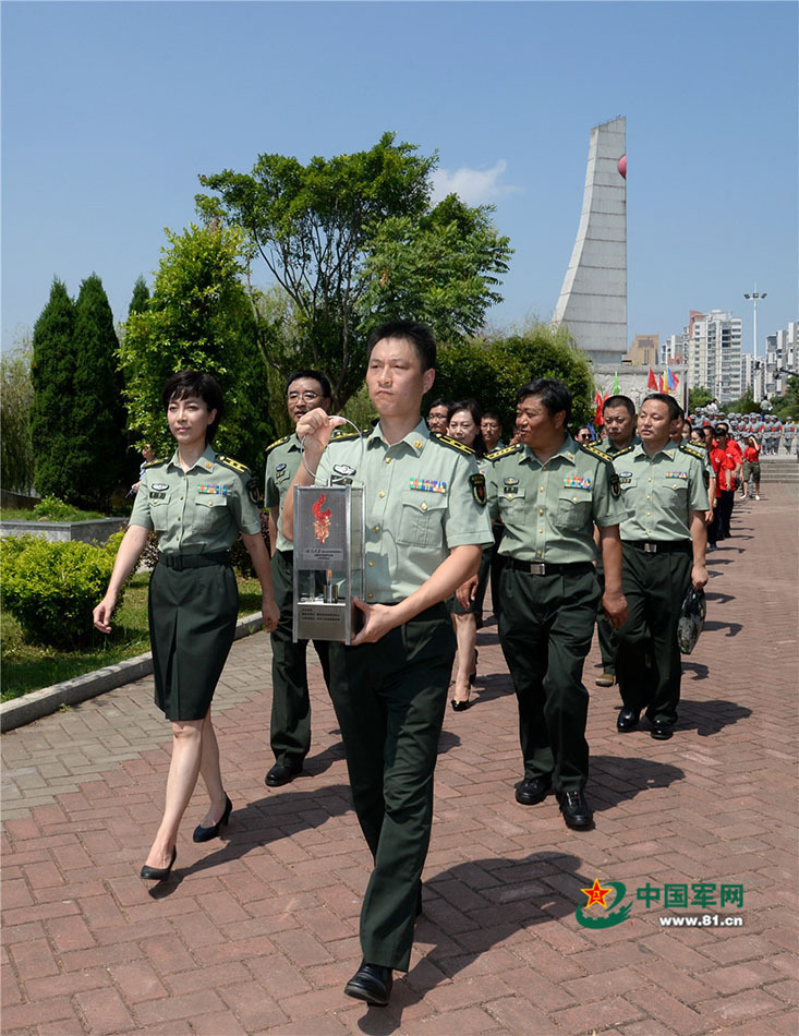 解放军报社记者代烽和解放军电视宣传中心主持人俞洁护送火种灯,在军事记者、红军后代、当地干部群众的护送下,前往于都河渡口登船渡河。记者岱天荣摄影