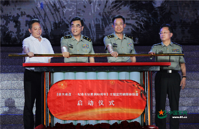 解放军报社社长李秀宝(左二)、江西省委常委、宣传部长陈俊卿(左一)、江西省军区政委杨笑祥(左三)、解放军电视宣传中心主任唐水福(左四)为《雄关漫道--纪念长征胜利80周年》主题宣传融媒体报道启动仪式揭幕。记者王传顺摄影